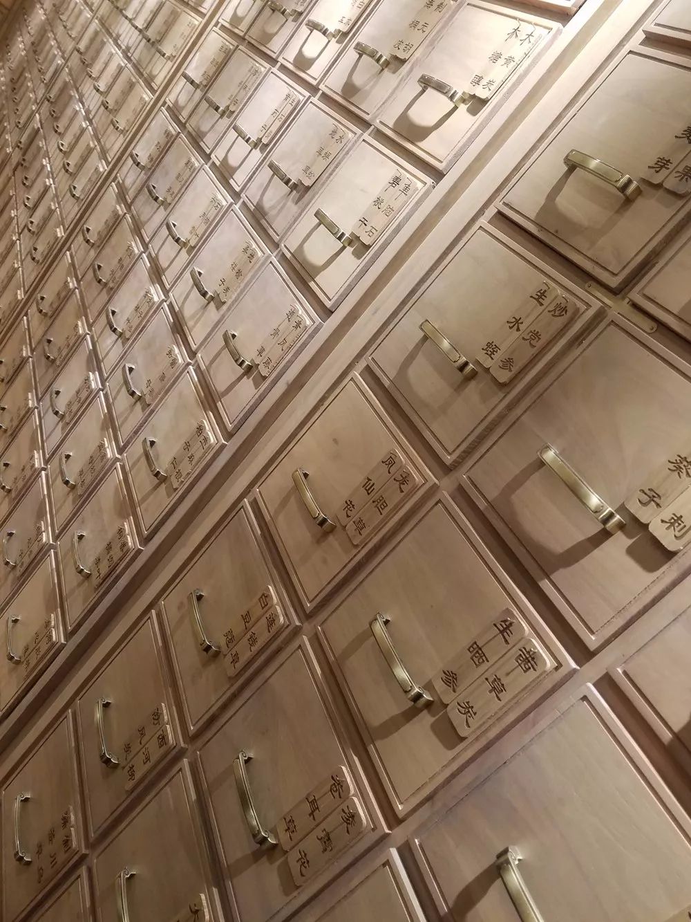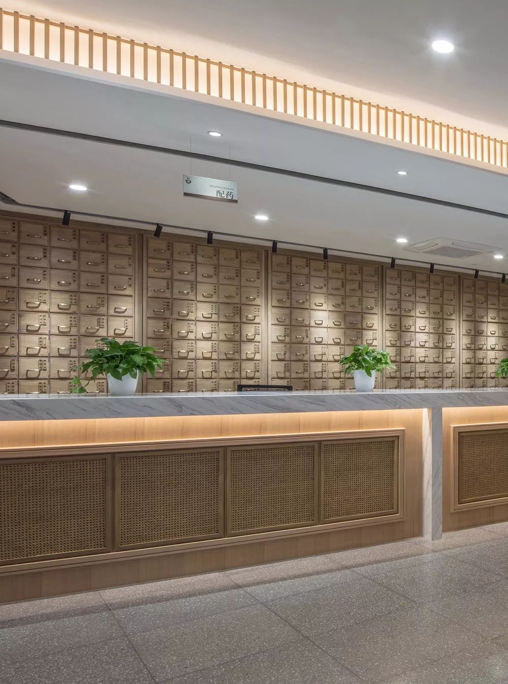 柜臺(tái)和存放藥材的百子柜,往往是一個(gè)醫(yī)館的核心,在本次設(shè)計(jì)中依然保留了傳統(tǒng)的醫(yī)館模式,貝聯(lián)珠貫的小抽屜呈現(xiàn)嚴(yán)謹(jǐn)?shù)闹刃蚋?,在燈光下熠熠生輝。