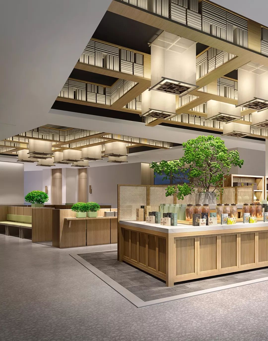 吊頂上燈飾錯(cuò)落,更顯視野開闊空氣流動(dòng),窗明幾凈,不需要太多的神秘感,顯得更加開放自然。實(shí)木和透光材質(zhì)的吊燈凸顯古風(fēng),但又滿足現(xiàn)代照明需求,傳遞了現(xiàn)代美學(xué)與傳統(tǒng)工藝有機(jī)碰撞。