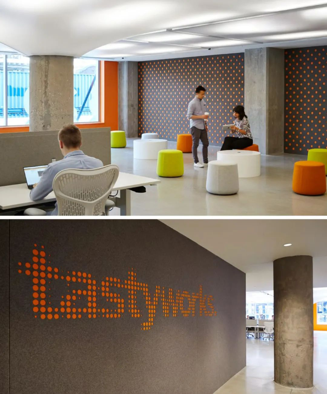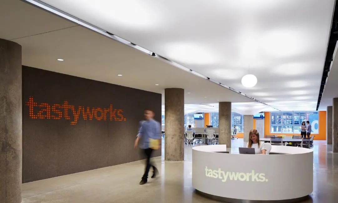 網(wǎng)絡(luò)證券公司Tastyworks的芝加哥辦公室,是一棟冷庫改建的辦公大樓。接待區(qū)的Logo 墻面,設(shè)計(jì)選用了Filzfelt棕色的200和橙色的151色號羊毛毛氈,雙層疊加后在表層飾面精確鏤空,將Tasty Works公司的logo通過底層明亮的橙色毛氈透出,克制而不張揚(yáng)。